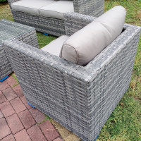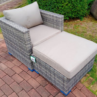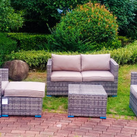 Ross James Luxury Garden Furniture , Aluminium framed hand woven mixed grey rattan 5 piece set featuring:Two seater sofa - 145cm x 74cm x 68cm2 x Armchair - 74cm x 74cm x 68cm EachCoffee Table - 64cm x 64cm x 41cmFoot Stool - 64cm x 64cm x 33cmAll of the furniture is constructed with a high grade aluminium frame, hand woven mixed grey HDPE rattan . With extra thick 10cm chair cushions and the fully padded back cushions meet all UK fire retardant standards and are showerproof and washable. The table features 5mm tempered glassThis set is perfect for home entertaining. It has a 2 seater sofa, 2 armchairs , a foot rest and of course a table. Ross James garden furniture is designed to last and is showerproof and has been designed for life outside. The cushions can easily be cleaned and the rattan is maintenance free. The glass top table is 5mm tempered and is easy to clean if you spill any drinks etc on to it.Why Choose Ross James luxury garden furniture?The answer to this is a simple one. Ross James luxury garden furniture as a brand only uses the highest grade raw materials and every item is made to their exact and strict spec. The Frames are made from premium aluminium which last a lot longer then many of the cheaper steel options out there. The Rattan is super luxury , hand woven HDPE and fully maintenance free. The thickness of the rattan frame is also more then many competitors making it a lot more durable. The seat cushions are a very thick 10cm with the back cushions fully padded and of course it meets all UK fire regulations . It is showerproof and the cushions are machine washable , you simply unzip the covers from the cushion and put them into the machine.Key features at a glance:Hand woven HDPE RattanAluminium FrameThick 10cm Seat cushions with padded back cushions. Machine washable coversMaintenance free and rust resistantFire retardantShowerproof